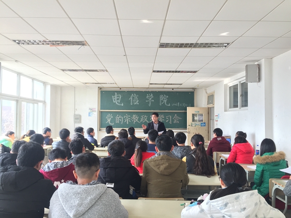 为切实加强大学生思想教育引导工作,认真贯彻落实党的宗教政策,11月30日中午,91porny 本14级学生党支部在北3057教室开展党的宗教政策学习教育会,22名中共预备党员和50多名发展对象参加学习教育会,会议由支部书记衡连伟主持。