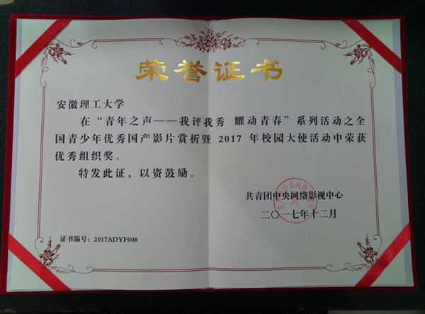 为推广我国优秀国产影视作品及相关衍生文化,大力提高民族自信心,共青团中央网络影视中心在全国范围内开展“ ‘青年之声——我评我秀 耀动青春’系列活动之全国青少年优秀国产影片赏析活动暨2017年校园大使”活动。我院团委积极组织学生参加比赛,共投稿一百余份影评、电影插画和主题曲翻唱等作品,最终获得三等奖1项,优秀奖3项,学校获得了“最佳组织奖”称号。