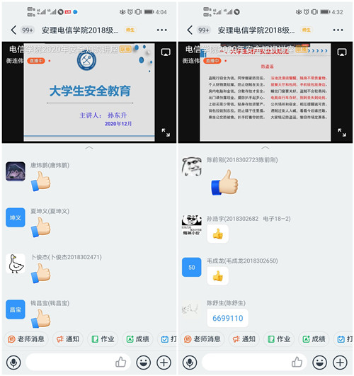 电气19-6王虎同学深有感慨地说,以往到现场听完报告回去再向同学们传达,总觉得效果大打折扣。这次讲座采用直播的方式让全体同学都能够全程参与,让不能到会场的同学一样享受到生动全面的安全教育,将安全观念深植到每一名同学心中,真是值得点赞!