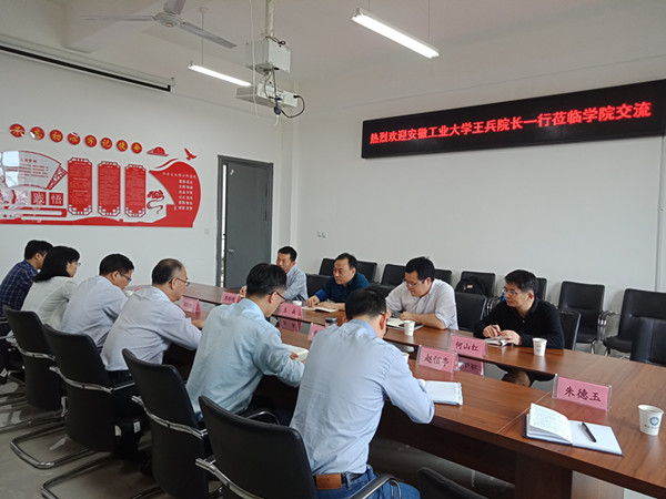 5月13日中午,安徽工业大学91porny 院长王兵一行4人来91porny 交流学科与专业建设工作,91porny 执行院长周孟然在励行楼B415会议室接待了王兵一行,91porny 业务副院长欧阳名三、曹珍贯及相关专业系主任参加了交流会。